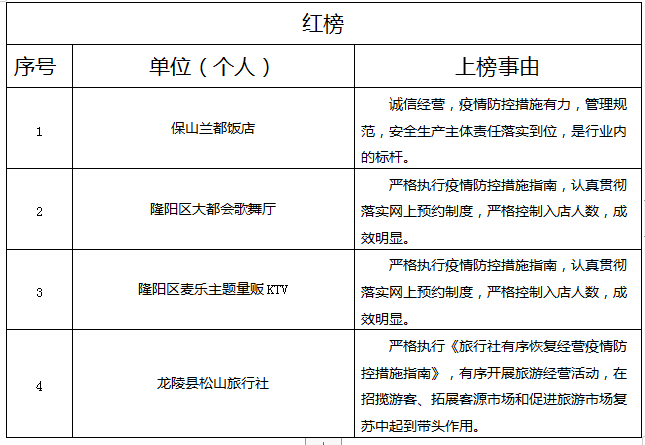 為認(rèn)真貫徹落實(shí)《云南省人民政府關(guān)于印發(fā)云南省旅游市場秩序整治工作措施的通知》(云政發(fā)〔2017〕19號)及全省推進(jìn)“旅游革命”現(xiàn)場會暨“一部手機(jī)游云南”工作領(lǐng)導(dǎo)小組第15次會議精神,根據(jù)《保山市文化和旅游“紅黑榜”制度》,決定將誠信守法的涉文、涉旅企業(yè)和有關(guān)從業(yè)人員納入紅榜,予以通報(bào)表揚(yáng);將違反文化、旅游相關(guān)法律法規(guī),受到行政處罰的涉文、涉旅企業(yè)和有關(guān)從業(yè)人員納入黑榜,予以通報(bào)警戒。現(xiàn)將名單通告如下,接受社會監(jiān)督。